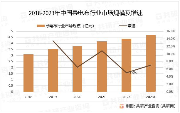 受益于终端产业的飞速发展,导电布产品的市场需求持续激增,从而推动了整个行业规模的不断扩大。随着近几年来,伴随着下游产业链发展日趋完善,导电布的市场需求量也呈现出逐年递增的趋势,呈现出蓬勃向上的发展态势。历经了漫长的发展历程之后,我国已经成功跻身为全球导电布制造业的重要一极,并实现了该行业规模不断扩张和优化升级的双重目标,其中2022年中国导电布行业市场规模同比增长5%。