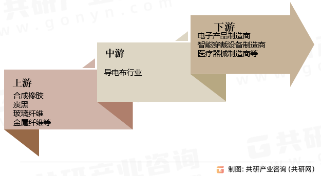 导电布材料具备卓越的综合性性能,因此在电子制造、家电设备以及汽车制造等众多领域内均有着广泛且普遍的实际运用,导电布的主要原材料包括合成橡胶、炭黑、玻璃纤维、金属纤维等,导电布行业下游英国包括电子产品制造商、智能穿戴设备制造商、医疗器械制造商等。