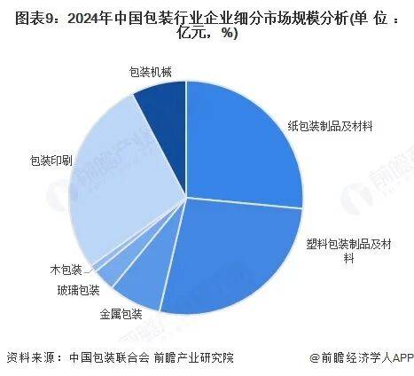 从各细分市场来看,2024年塑料包装和纸包装占市场超半数份额。塑料包装制品及材料完成累计主营业务收入5620亿元,占比27.19%;纸包装制品及材料,营业收入5476亿元,占比26.50%;金属包装约1508亿元;玻璃包装约 651亿元;木包装约207亿元;包装印刷约5624亿元;包装机械约1581亿元。