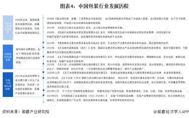 我国包装行业经历了高速发展阶段,现在已经建立起相当的生产规模,已经成为我国制造领域里重要的组成部分。我国包装行业政策发展历程主要可分为三个阶段,十二五时期以前,我国包装行业处于初步成长期,政策集中在产品技术规范、市场准入制度等基础制度及规范的完善;2010-2020年,随着国家对环保的重视程度不断提高,包装行业开始向绿色包装方向发展,政策着重于限制过度包装、体长绿色消费、构建绿色包装标准体系等方面;2021年以来,我国包装行业进入快速发展期,绿色包装建设取得初步进展,国家政策集中在进一步完善包装产业链建设,实施“可持续包装战略”加速构建绿色发展体系,同时,综合利用5G、物联网、工业互联网、大数据、云计算、区块链、人工智能、虚拟现实和增强现实等新一代信息技术,推进行业数字化转型和智能化升级,发展先进制造业集群。