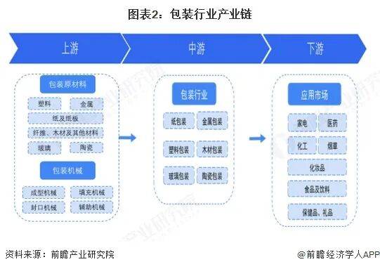 包装产业链上游主要是包装产品生产的重要原材料,如纸、塑料、玻璃、铝材、钢铁等,是包装行业产品不可或缺的组成部分。此外,上游还包括位于包装生产线前端的设备:成型机械、填充机械、封口机械和辅助机械等。包装产业链指包装的制造,可按原材料认为纸制品包装、金属包装、塑料包装等;产业链下游应用市场涵盖各行各业,几乎国民经济绝大部分重要行业都与其息息相关,其中医药、食品饮料、日化、化工和家电行业等是包装行业产品应用相对广泛和典型的行业。